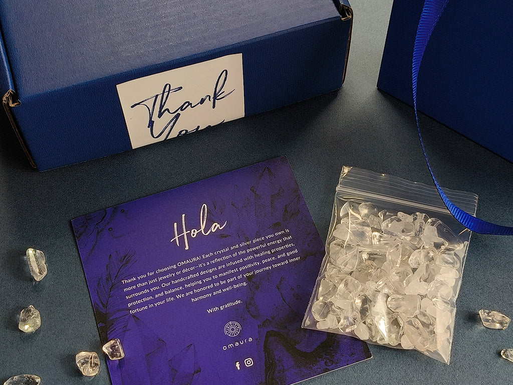 At OMAURA, we believe that every detail matters—including how your bracelet arrives. Our packaging is thoughtfully designed to create a memorable unboxing experience that reflects the care, quality, and intention behind each piece. From the warm greeting to the crystal gravel for cleansing, every element is crafted to welcome you into the OMAURA family and support your journey of balance and well-being.